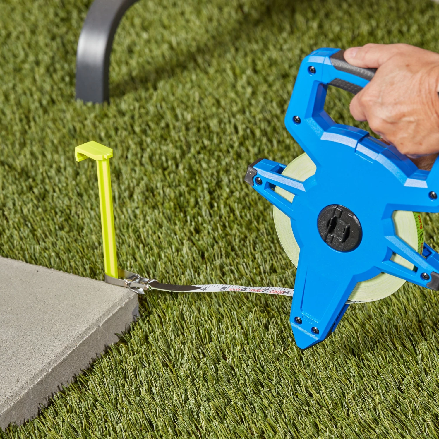 The Kobalt pro fiberglass is the real deal. This 100-Feet open reel, double PVC nylon coated, fiberglass blade is produced to work. This work horse has a durable impact resistant case protecting it from the harsh conditions of a professional job site. When working, you need speed and accuracy. That’s why the Kobalt 100′ pro is built with 3 to 1 high speed rewind and a versatile end hook. This end hook is dynamic and will provide for easy one person measurement.
