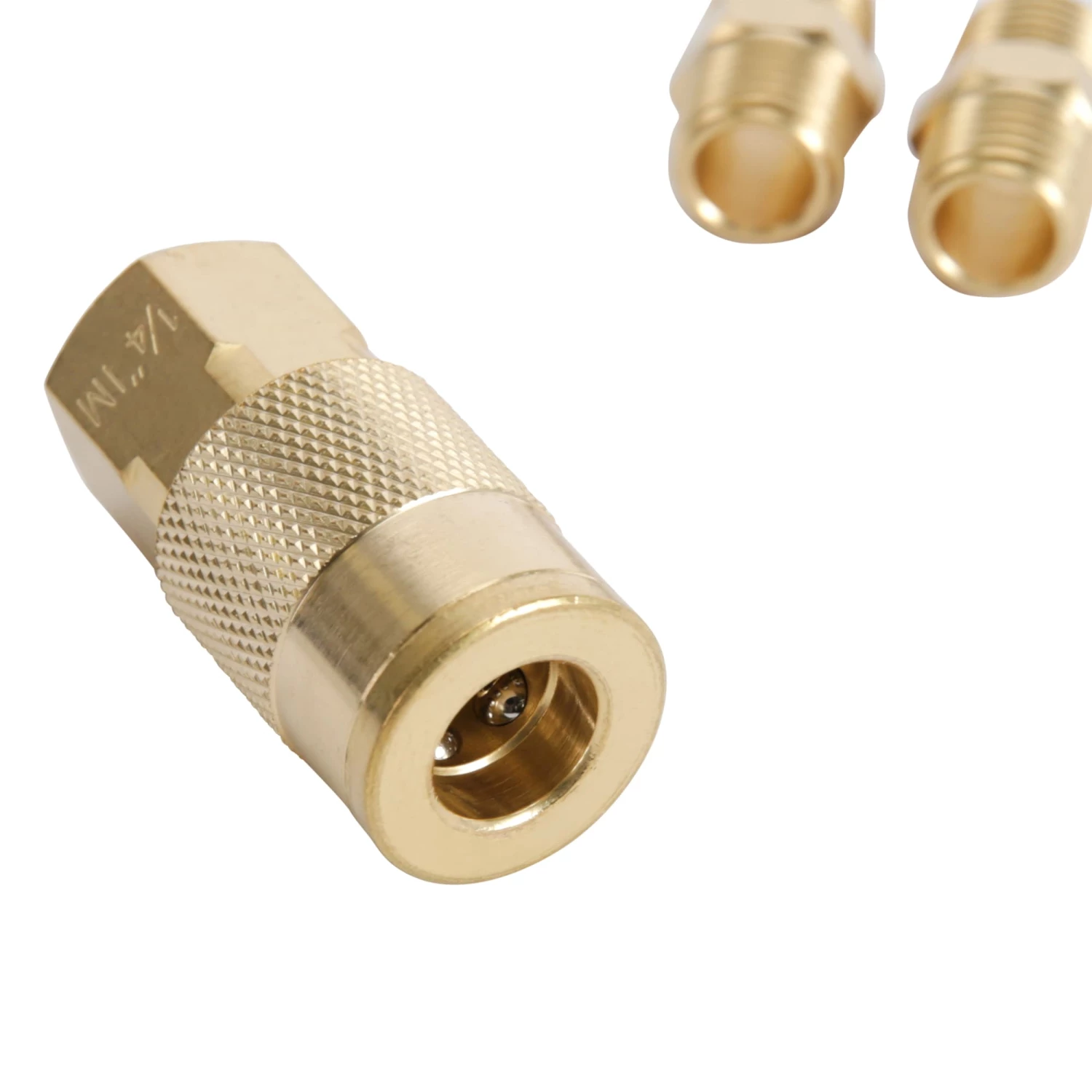 - Includes blow gun, rubber tip, tire gauge, sports ball needle, tapered tip, thread seal tape, two 1/4-in female plugs, two 1/4-in male plugs, 1/4-in female coupler, 2 quick connectors, two 1/4-in male couplers, safety nozzle, dual tire chuck and storage bag
