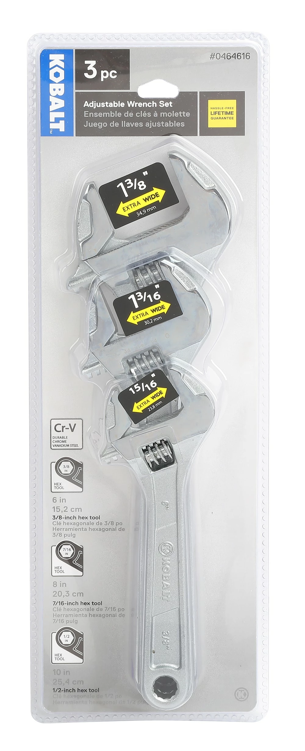 - Kobalt 3-piece tool set includes 6-in, 8-in and 10-in adjustable wrenches with extra-wide jaws for versatility