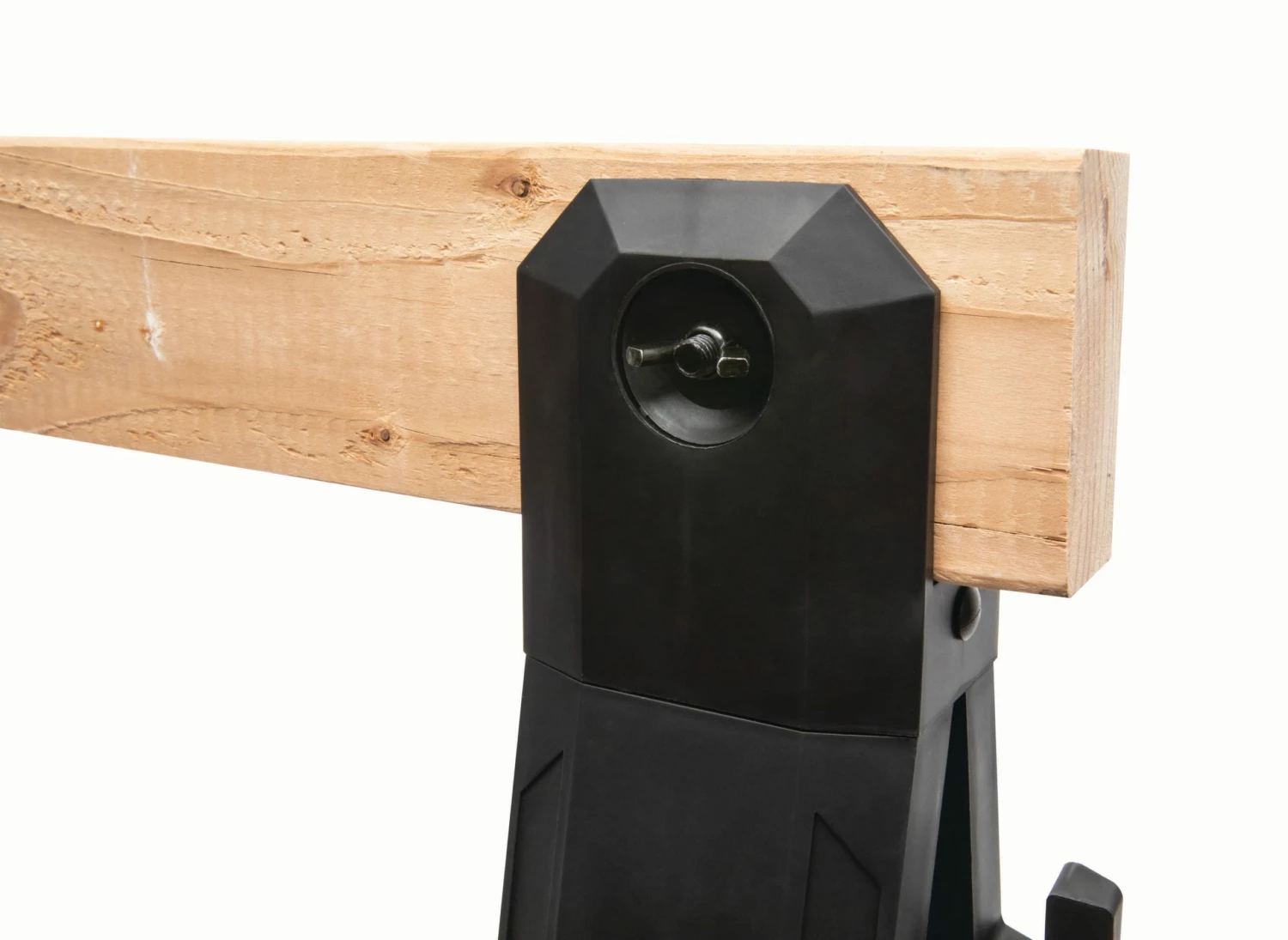 Kobalt’s 31-inch 4-in-1 flip-style worktop sawhorse has a removable support with a built-in V-notch on one side and lateral V-notch on the other for working on round objects as well as built-in clamping slots for toggle clamps. While in the lowest height setting, each saw horse has 1,100-lb load capacity, and can be paired to create a table-top workspace with a weight capacity of 2,200 pounds.