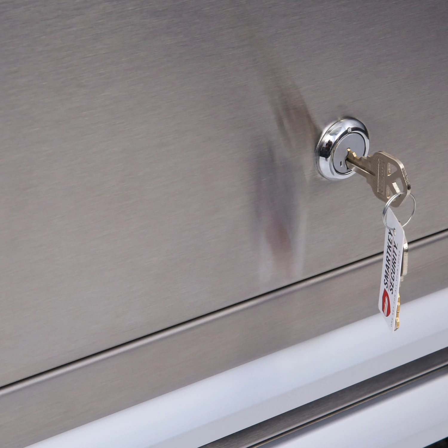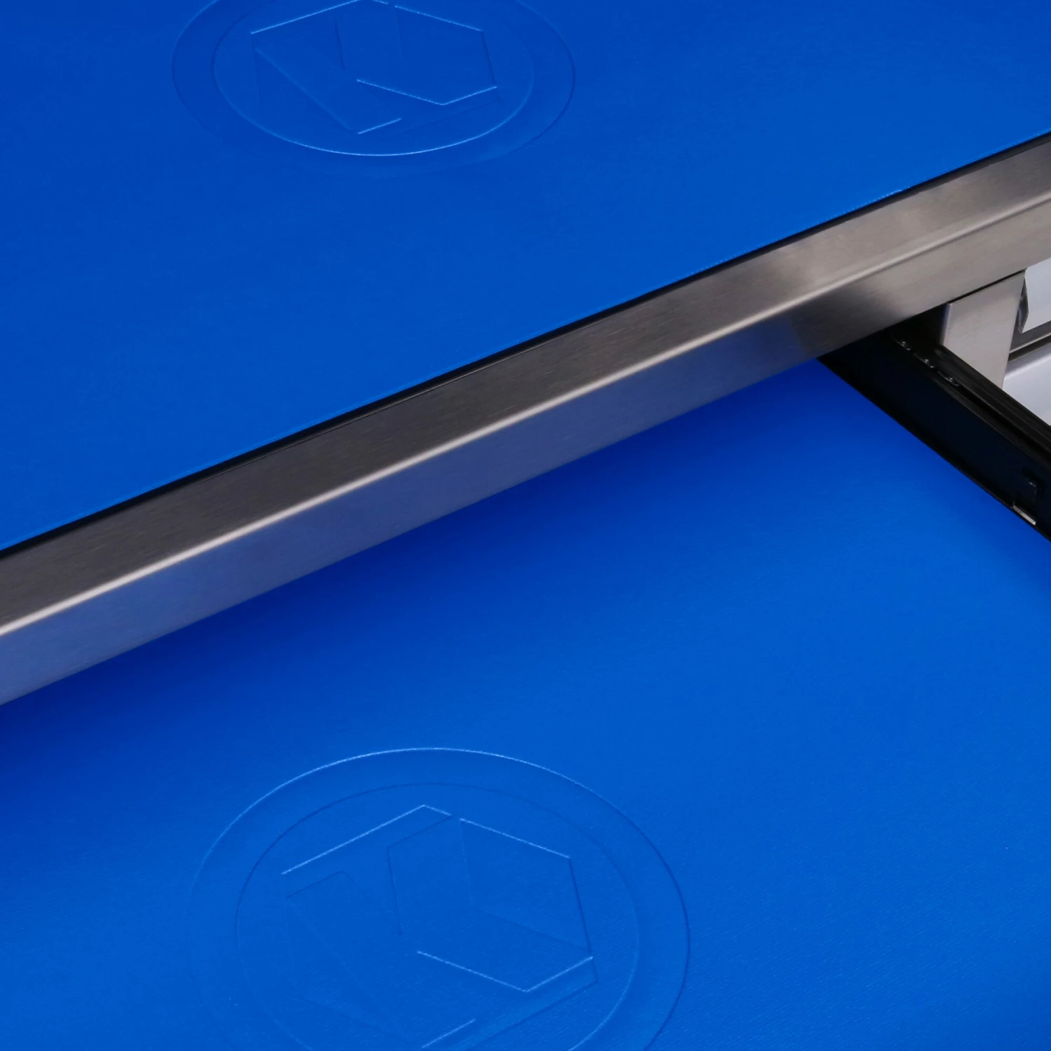 This Kobalt 3000 series heavy duty stainless steel tool chest is ready to serve. With almost 15,000 cu inches of storage and a 1000 lb capacity, this chest is built to last. This chest has heavy duty, ball bearing drawer glides for smooth functionality when full loaded. Couple this with their soft close feature and you don’t have to worry about the drawers opening or slamming closed when you are moving the chest. Coordinating custom fitted drawer liners protect your tools from scratching or rolling around. This box is built tough with double walled construction and recessed sure grip side handles.