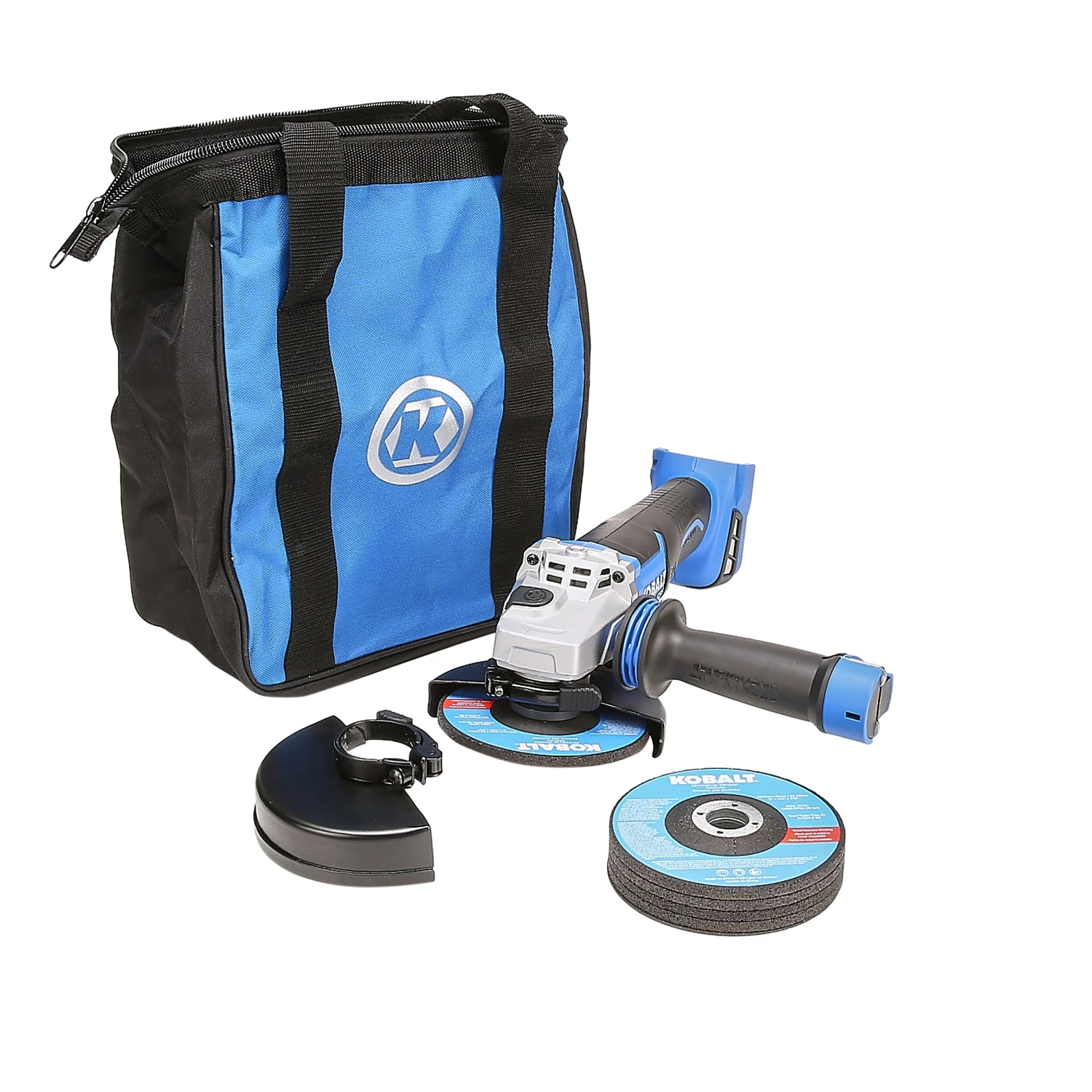 - Kit includes: 24-volt max angle grinder/cutoff tool, 1 grinding disc, 1 cutoff disc, 1 grinding guard, 1 cutting guard, 1 wrench, 1 auxiliary side handle, 1 soft carrying bag, one 5.0-Ah battery, and 1 charger